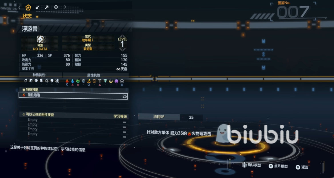 001、水母兽,特殊技能为闪耀之眼,可喷出泡沫状物体攻击。
