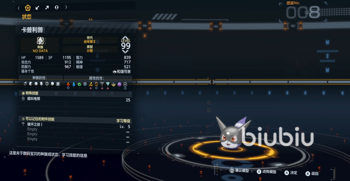 008、卡普利兽的特殊技能为嚎叫电频,针对敌方单体进行攻击,而且攻击时会有20%的概率麻痹敌人。等升级到5级之后还可以学会破坏之剑,对单体目标造成8*5的钢物理伤害,命中率达到90%。