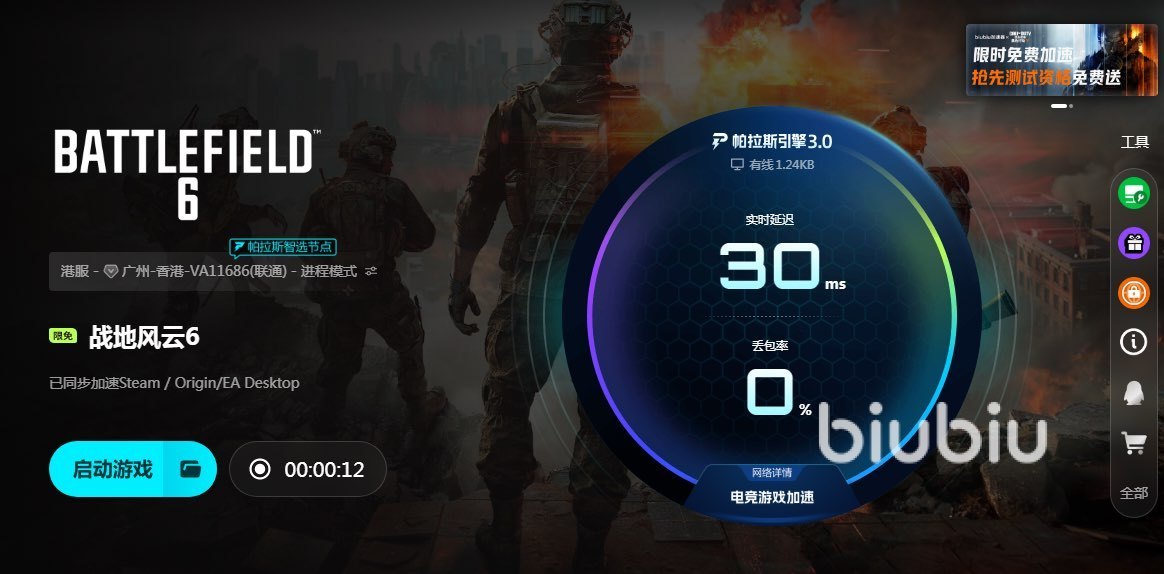 前不久该加速工具邀请了选手Aixleft展开深度合作,并推出了专为大型战场优化的帕拉斯引擎3.0。而这些优化提升能够帮助精准识别并规避战地6中常见的网络异常问题。并且还给伙伴们准备了很多的福利,若是新人第一次尝试该加速工具,直接在登录的时候就可以得到平台所赠送的24个小时免费优化时间,此外带着【biubiu不卡顿】能够跟平台的所有用户们一起,兑换到三天的继续加速时间,叠加在一起一共96个小时的时间,足够大家了解和习惯这款加速工具的存在。