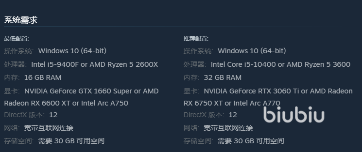 目前游戏已经上线steam平台,并且相关的配置需求也展示在商店页面,可清晰的看到,最低配置需要玩家拥有i5-9400F处理器,另需内存条达到16gb的标准,显卡要有GTX1660的水平,而存储内存需求不高,有30gb就够了。想要开启中等画面以上的设置,则需要玩家拥有i5-10400处理器,内存条升级到32GB,显卡也要提升为RTX3060的标准。
