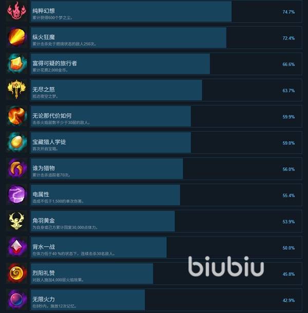 如果细分全成就的话,可分成战斗类成就,包括谁是猎物、不可企及、无限火力,超凡之速,这里有挑战类和重复类的,也有探索核心玩法的类别,让玩家熟悉职业的技能释放;探索类的成就有福得可疑的旅行者,草丛之蛇、无尽之怒,这三个成就主要是对游戏内容的探索;接下来是特殊机制类的成就,包括无论代价如何,纵火狂魔、纯粹幻想,这三个成就其实都和刷怪有很大关系,击杀特定的小怪是获得这些成就的基本条件,击杀boss也好,重复刷怪,很明显在玩梦之形是,是需要好的网络支持的,对于国际服游戏,小编推荐大家使用已完成核心技术升级的biubiu加速器。