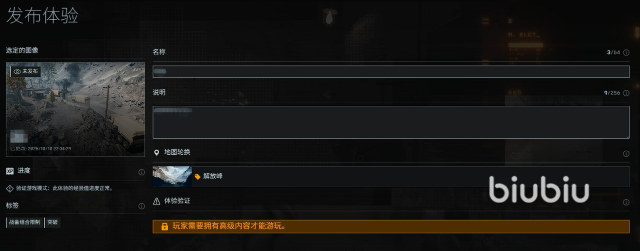 其他项目基本可以不用调整,当然也可以进行一些个性设置,大胆改变核心规则,例如开启无限弹药、关闭坠落伤害,或者改变胜利条件(如基于击杀数而非占点)。完成所有设置后,为你的服务器命名并选择一张封面图片以便识别。随后点击保存并发布。发布成功后,系统会生成一个专属的体验代码。复制此代码。