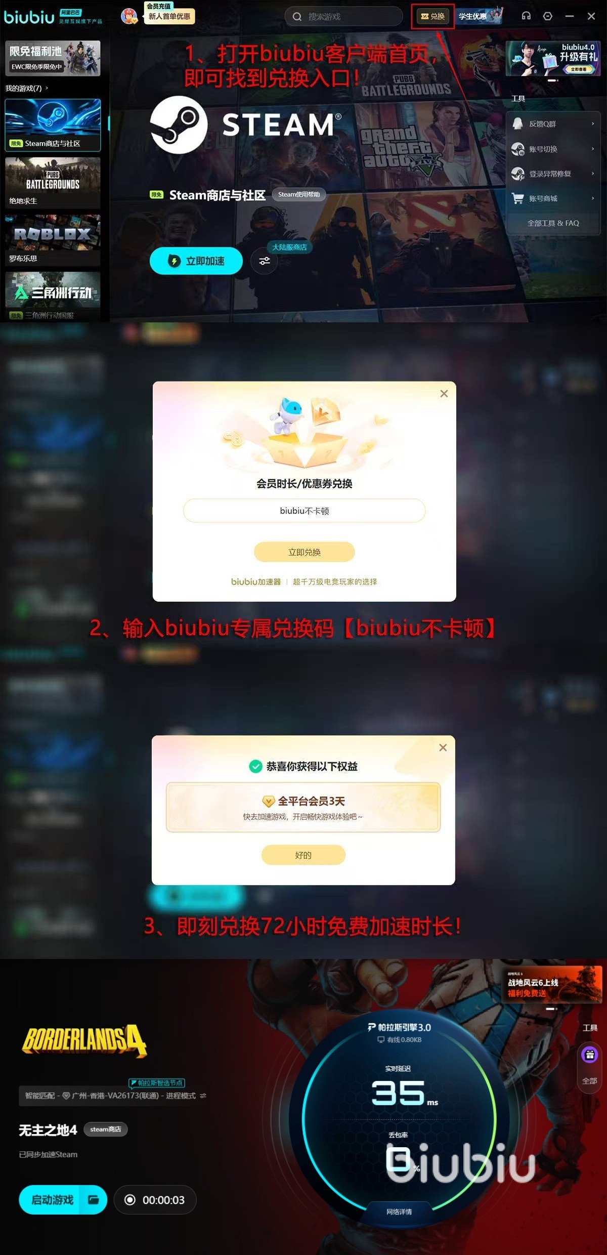 并且在福利这块,作为平台新用户群体,第一次登录biubiu时,可顺利领取24小时加速,让各位来试用了解具体性能表现,还可点击界面中兑换,然后再通过口令【biubiu不卡顿】,如此所有玩家均可顺利领取到72h的加速时长。