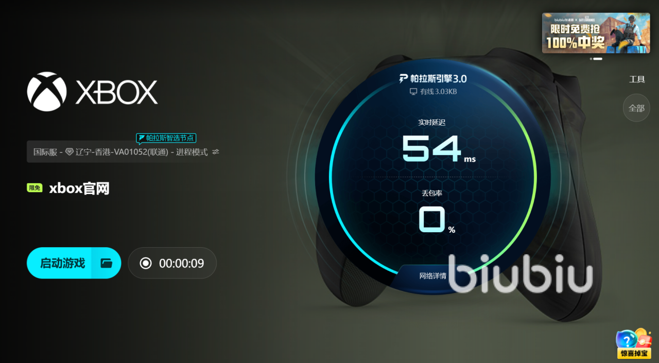 使用方法也很直观。打开biubiu客户端,选择xbox平台加速后点击开启,根据提示进行网络连接,整个过程简单提示清晰小白玩家也很容易理解上手操作。而且biubiu加速器后台占用极低,不影响帧率或系统性能。加速完成后回到游戏,连接更稳定,加载更快,主机与服务器之间的数据交换顺畅无阻。
