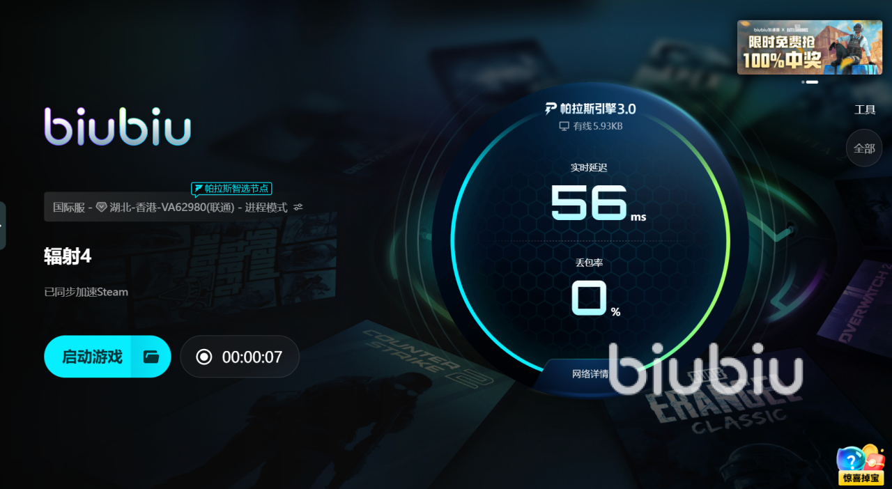 解决问题不能只靠删MOD或重装游戏,关键在于让数据通道顺畅。biubiu加速器能针对Steam平台进行通用加速,通过优化网络路径来减少加载阻塞。新用户注册后即可获得二十四小时加速时长,在客户端首页输入口令【biubiu不卡顿】还能额外领取七十二小时。三天的完整体验足够覆盖从下载安装到游戏运行的全过程,尤其适合想彻底摆脱闪退卡顿困扰的玩家。