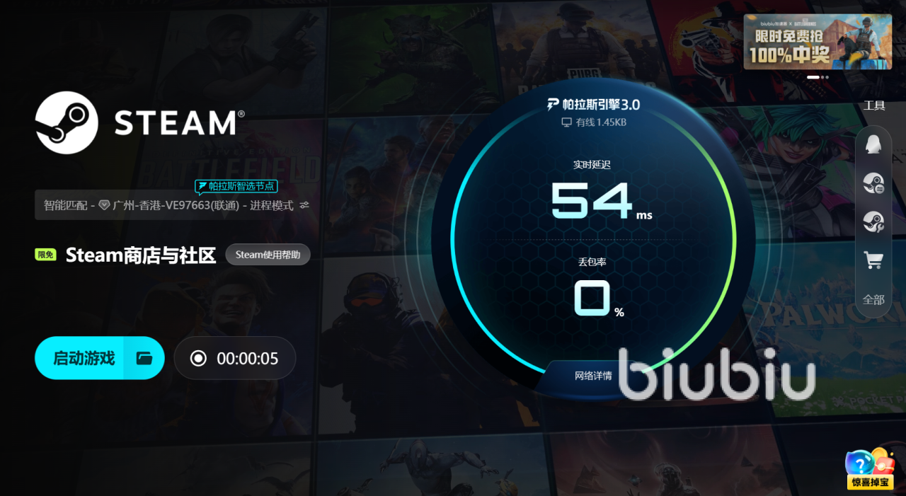 解决这种问题不能只靠重装或清缓存,根本得从网络入手。biubiu加速器可以直接优化Steam通道,通过通用加速功能重建连接路径,让数据传输更短更稳。它会绕过拥堵节点,减少丢包和延迟,让客户端与服务器保持顺畅通信。连接一稳,闪退自然减少。新用户注册即可领取二十四小时免费加速时长,在客户端首页输入口令【biubiu不卡顿】还能额外领取七十二小时。几天的使用就足够覆盖游戏下载、启动、更新等所有阶段,避免闪退反复出现。