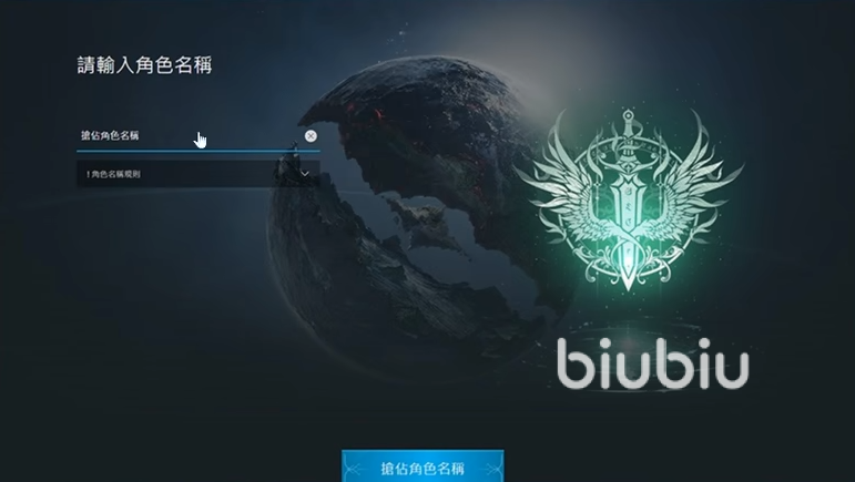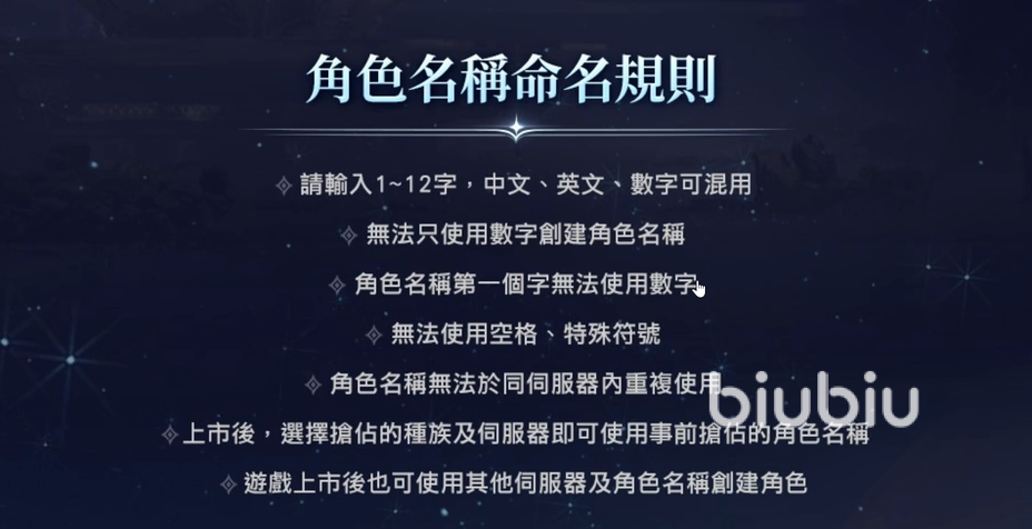 选好后就来到了命名界面,注意一下命名规则,需要1-12字,可以中英数混用,同一服务器内的角色名称不可重复,但不同服务器间可以重用。另外一个小细节,就是建议大家切换为繁体中文去注册,因为使用的是台湾服务器,避免后面出现名字无法识别等问题。