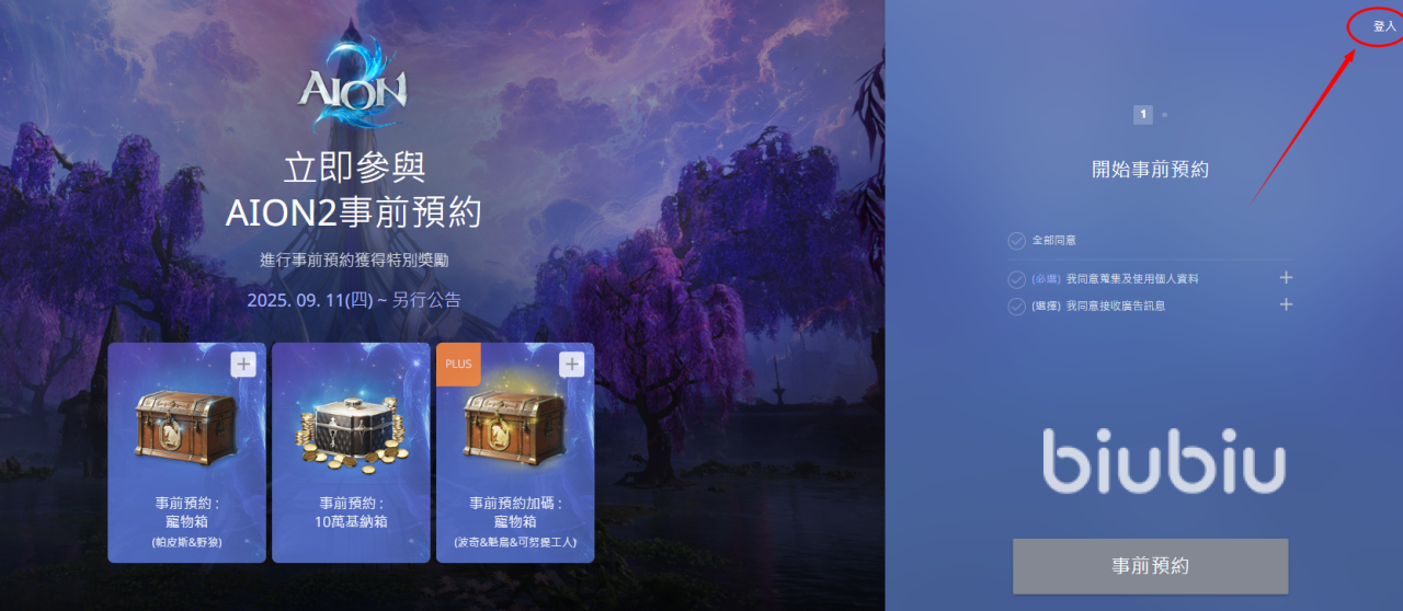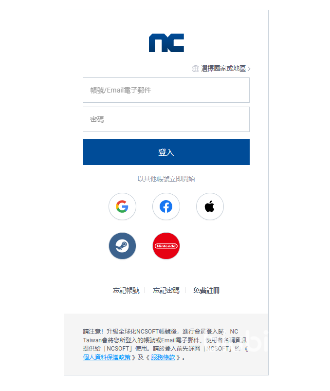 点页面右上角的"登入"按钮。注意先选一下国家和地区,这里有三个选项,但是想要抢占角色ID的一定要选台湾地区,然后使用你已注册的和密码登录系统。没有的话需要选下方的“免费注册”创建一下。过程比较简单,填写自己的邮箱即可,注意会有成年验证。