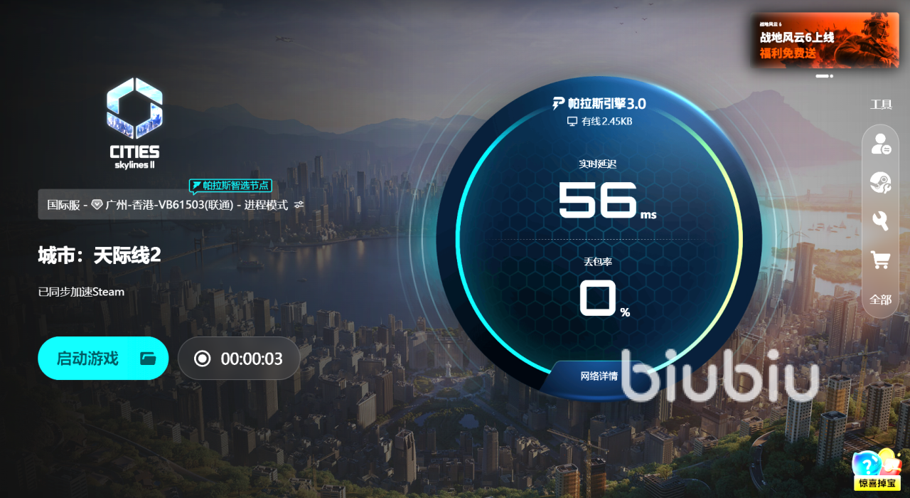操作上也很直观。打开biubiu客户端,选择天际线2专用加速。无需任何设置,系统会自动完成线路优化,仅用几秒即可生效。后台运行几乎无负担,帧率与性能始终满格输出。完成加速后重新打开游戏,加载速度明显提升,城市运行更加顺畅。地图缩放流畅、交通模拟无延迟,自动保存也不会再中途卡死。