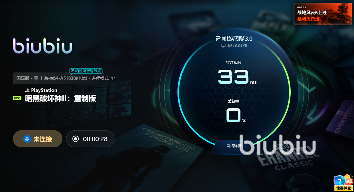 其实无论是哪一个方面的问题,本质上都是游戏所需的网络资源不足,无法把游戏数据在客户端和服务器之间传送,造成了太多的问题,包括画面出现卡顿,动作的断断续续,严重的时候会造成瞬间掉线,所以解决瞬间退出的问题,实际上就是解决网络传输问题,大家可以尝试使用近期更新后,拥有更强网络加速能力的biubiu加速器。