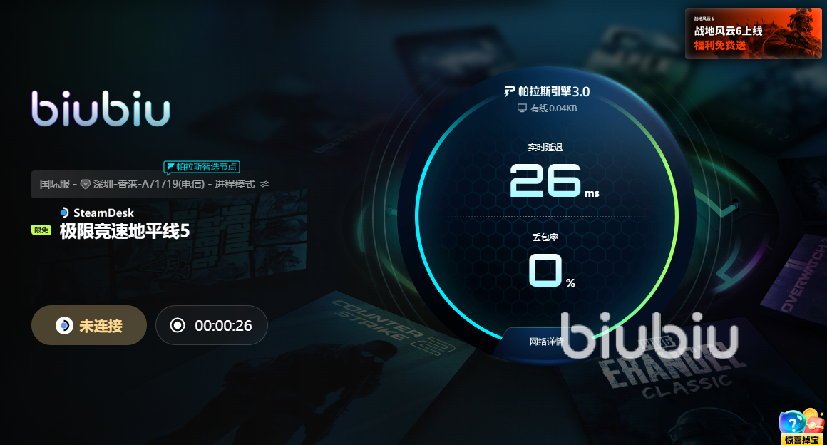 特别是当遇到一些特殊的问题时,biubiu自研的一些技术手段还能轻松解决,比如服务器在线高峰排队严重时,在游戏中时会有掉线严重的情况,biubiu就会提供更多的加速通道,通过同步发送数据的方式,确保数据传递的及时性,而为了稳定客户端的网络,biubiu将引入的帕拉斯引擎技术升级至3.0系统,结合自研的智能系统对网络进行智能调整,实现动态平衡,保证游戏不会因丢包出现各种问题。