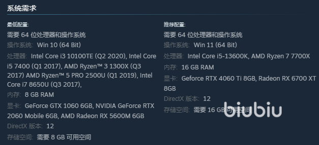 为了确保顺畅的游戏体验,操作系统Windows 10,处理器Intel Core i3-10100TE,内存最低为8GB,显卡英伟达 GeForce GTX 1060(6GB)。另外,需要预留8GB的可用空间,并且支持DirectX 12。