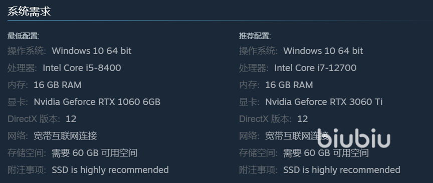 要保证游戏能够运行并提供可接受的基础体验,操作系统Windows 10,处理器酷睿i5-8400提供基本的运算能力支持,16GB RAM确保了在探索灰境时拥有足够的运行空间,Nvidia Geforce RTX 1060 6GB显卡可在较低画质设定下描绘灰境的轮廓,DirectX 12版本提供了必要的图形技术支撑,需提前准备至少60GB的可用硬盘空间存放游戏文件。