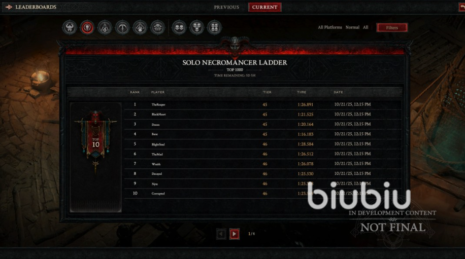 全新终局挑战:塔之试炼:这是一个限时10分钟的高难度随机地城模式。玩家需要在时间内通过击杀敌人或收集能量珠来推进进度,最终召唤并击败Boss。该模式设有全球天梯排行榜,支持按单人职业、组队(2-4人)、普通/硬核模式等多种维度进行排名。