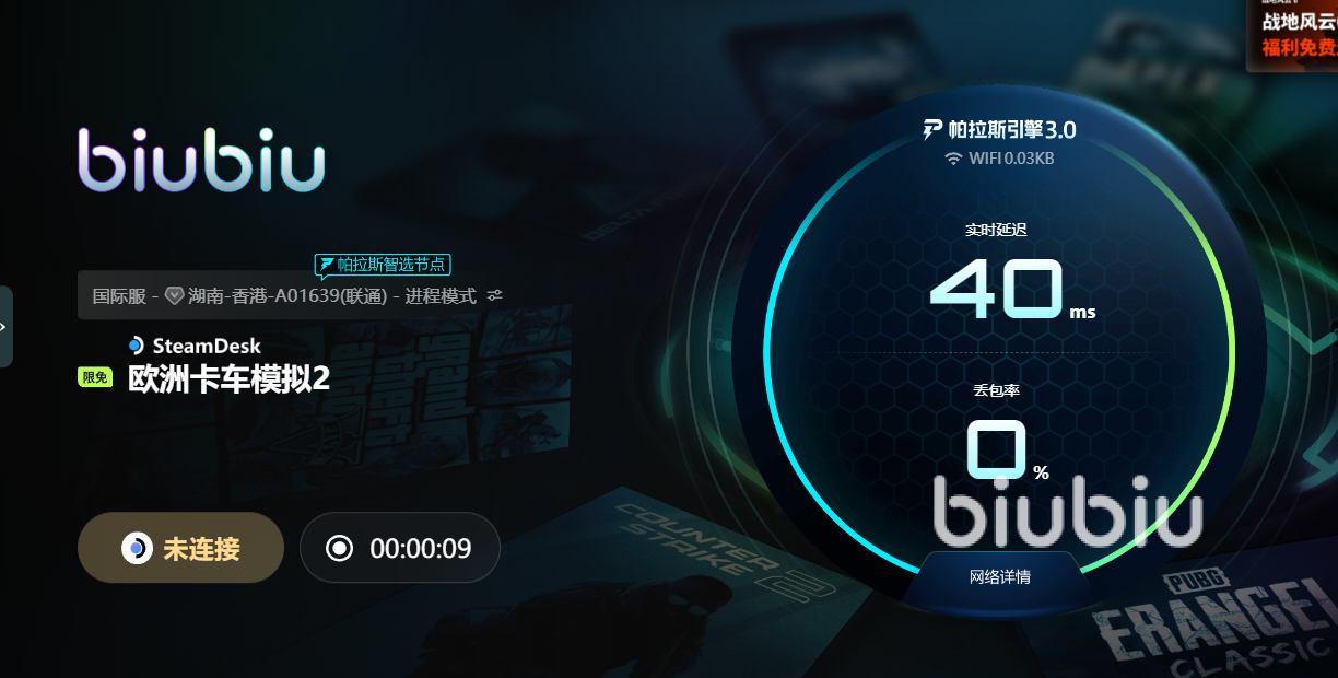 biubiu加速器不仅性能强劲,在实测中也表现出了出色的优化效果。许多欧卡2玩家反馈,开启加速后,游戏的加载速度明显提升,从城市切换到郊区几乎无卡顿;任务结算时不再出现掉线或数据不同步的情况。得益于帕拉斯引擎3.0的多线并行加速技术,即使在弱网环境下,也能保证数据传输的稳定性。无论玩家是在欧洲城市中穿梭,还是驾驶卡车穿越山路与隧道,biubiu都能保持流畅连接,避免闪退中断任务。同时,biubiu支持多平台加速,无论是PC端还是云游戏平台,都能获得稳定的网络体验。