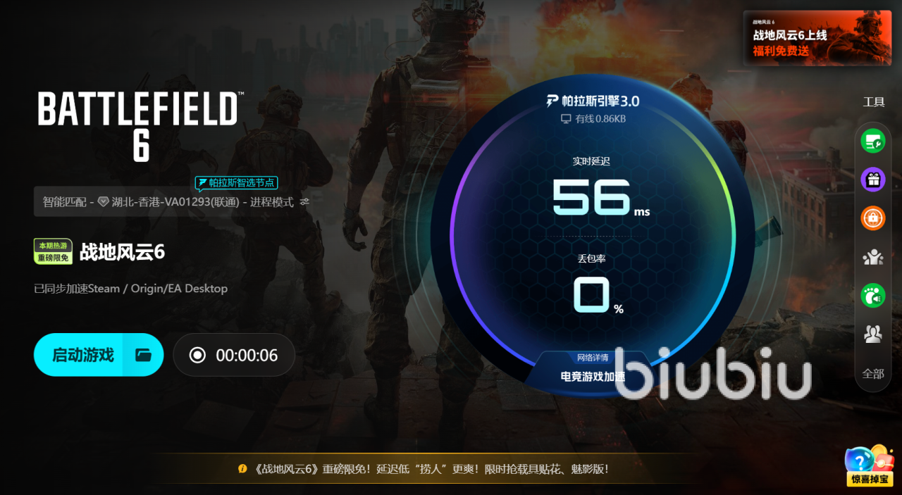 想让战地6真正稳定运行,必须从网络链路入手优化连接。biubiu加速器针对战地6提供专属节点,通过智能选线系统重新规划数据传输路径,将信号从拥堵区抽离出来直连服务器核心入口。线路稳定后,验证不再被卡住,加载反应更快,战斗画面顺畅衔接。完成注册即可开启24小时加速体验。在客户端输入口令【biubiu不卡顿】,新老用户都会再解锁72小时使用时间,无需等待也无需资格限制。从进入界面的那一刻开始,网络持续保持高稳定状态,让战场节奏全程连贯。