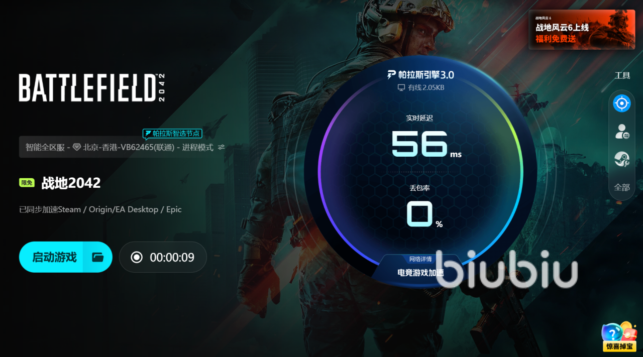 操作方式非常简单。打开biubiu客户端,选择战地2042并点击开启。系统会自动识别并连接到最佳节点,无需手动配置。后台运行轻量,不占用系统资源,也不会拖慢帧率。几秒钟内网络便能打通,重新启动游戏时即可快速登录,告别卡在加载界面的等待。加载条流畅推进,伴随熟悉的音乐声,游戏体验立刻恢复顺畅。