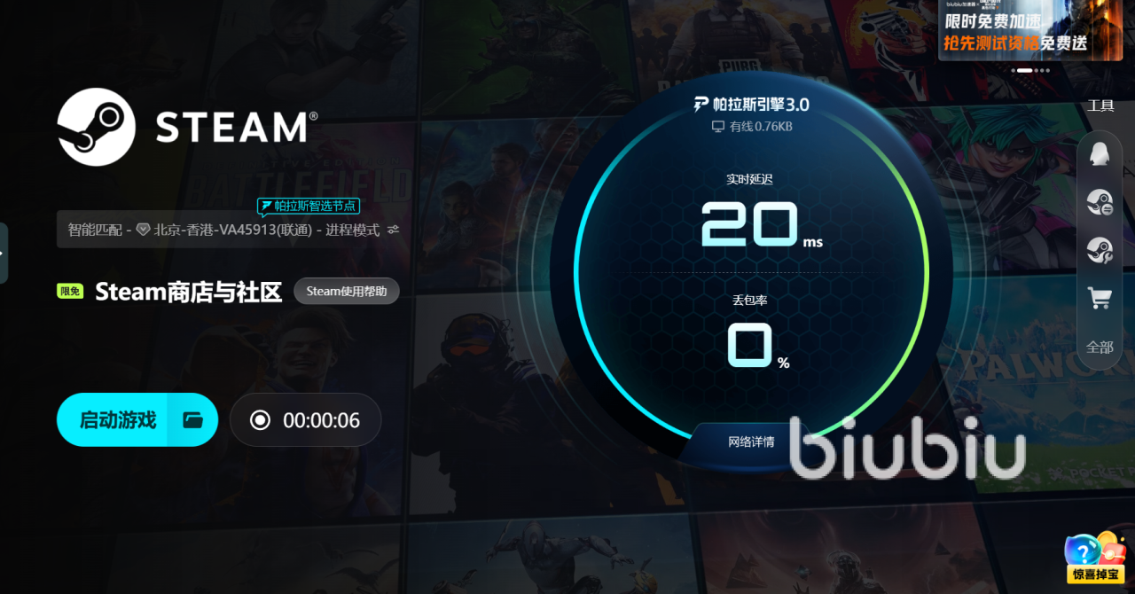 使用biubiu加速器的过程非常简单。只需启动客户端,选择Steam通用加速,搜索并添加你正在玩的游戏,然后点击开启。系统会自动为你优化连接,无需复杂的设置。加速过程中,后台占用极低,不会对帧率或CPU造成影响。几秒钟内,网络通道就被打通,游戏连接更稳定,匹配和加载速度明显提高。整个过程就像为网络加了一层隐形加速保护,让游戏体验更流畅,不再被延迟和卡顿困扰。