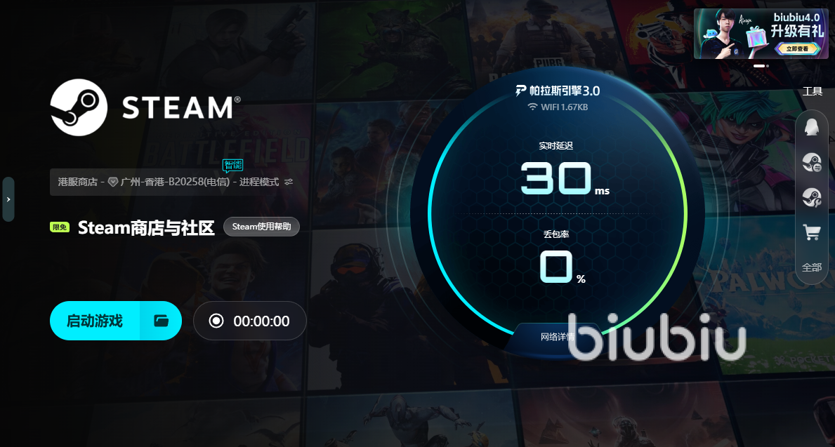 同时,为了避免会员遇到突然闪退的突发情况,biubiu还有针对性的开发了不少技术处理方法,比如解决服务器突发网络问题的多路发包技术,还有为解决本地网络被各种因素干扰,保持网络稳定,就引入了3.0系统的帕拉斯引擎,通过与自研的智能加速系统结合,利用智能匹配和数据补发技术,实现了对本地网络的实时稳定,避免了包括闪退在内的一系列问题的发生。