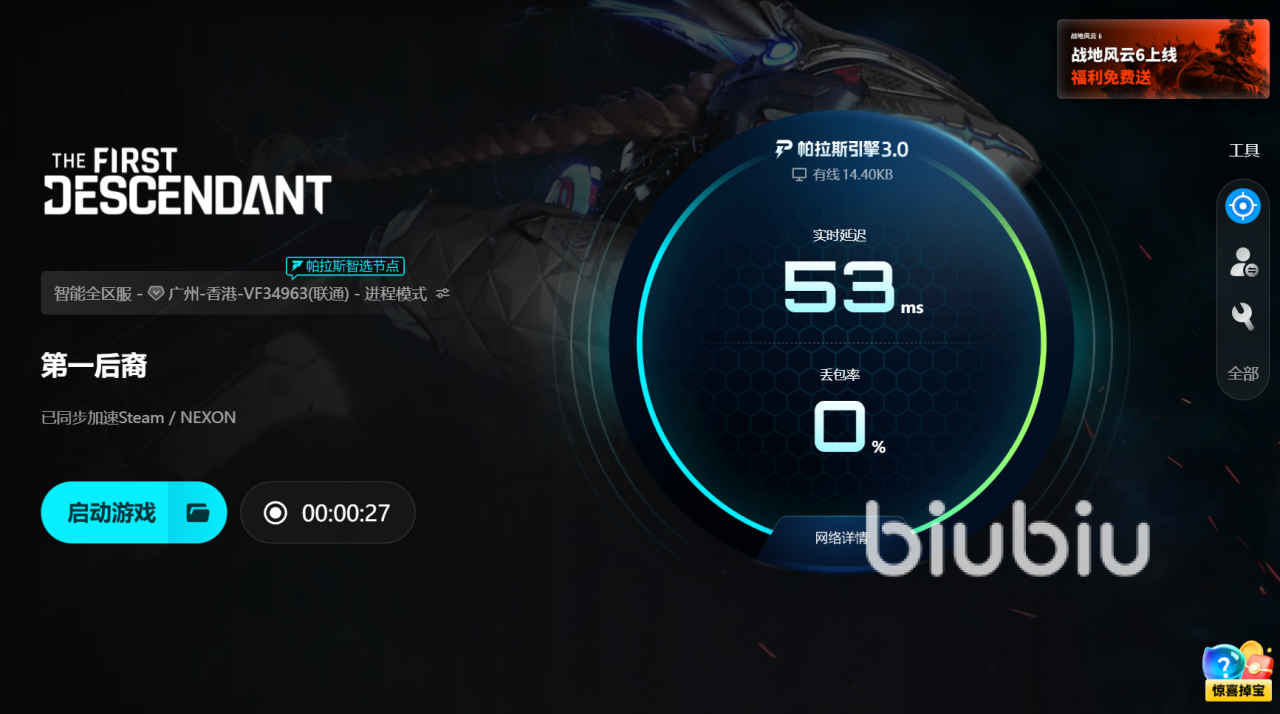 使用biubiu的过程几乎不费心思。启动客户端,找到《第一后裔》并开启加速,系统会自动检测网络状况,为连接挑选最稳定的通道。整个过程静悄悄地完成,不需要调整任何设置,也不会占用明显的系统资源。几秒后网络就像被理顺的水流一样顺畅,重新登录游戏时加载条稳稳推进,组队匹配也一次通过。那种原本卡在验证界面的焦躁感,瞬间被干净的流畅感取代。