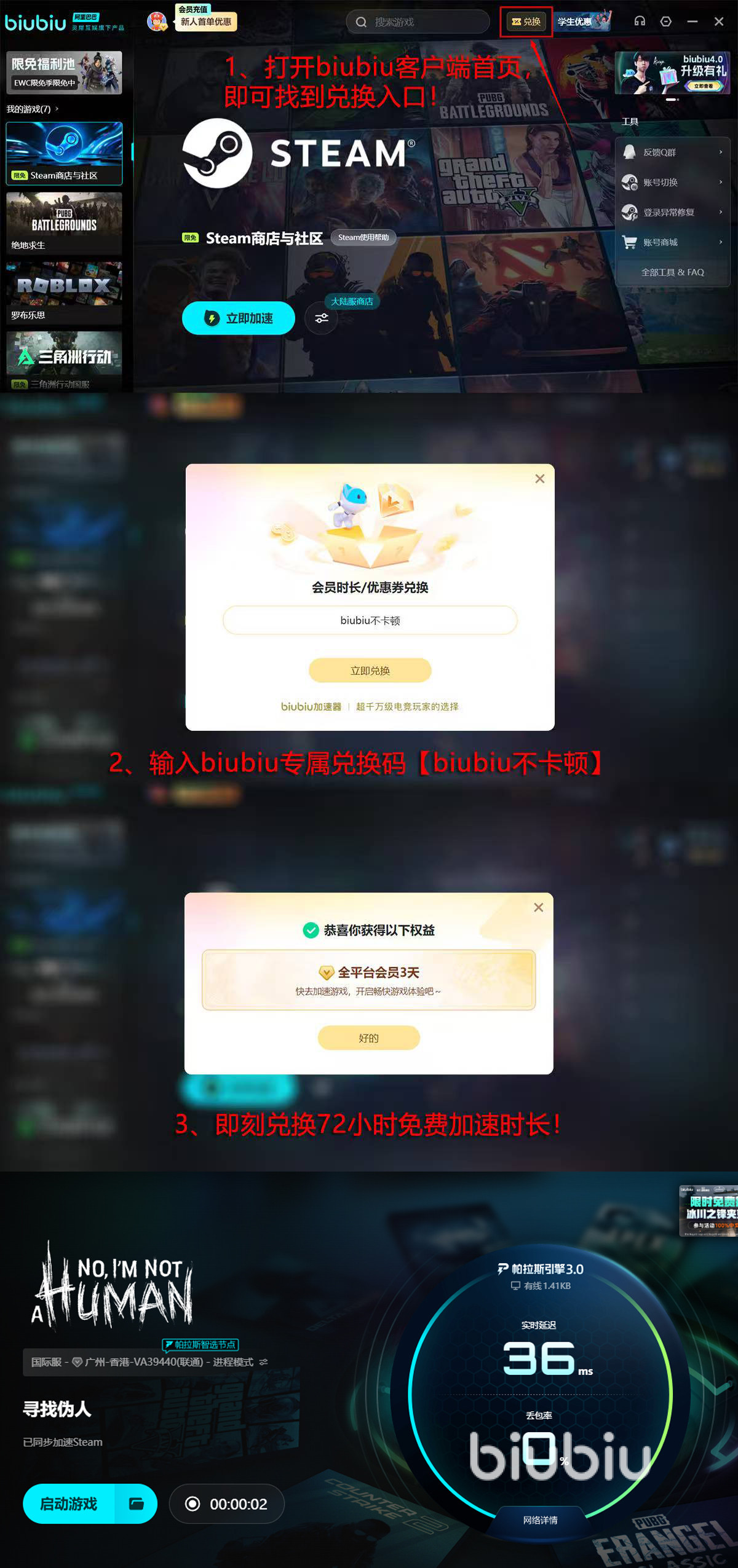 对于伪人的辨别,是需要不断积累经验的,和很多软件优化一样,在不断的吸收他人的经验中获得成长,biubiu就是通过品牌体验官左梓轩的合作下,对软件的操控进行了深度优化,现在,可领取3天免费体验机会,只需用【biubiu不卡顿】口令在首页兑换即可得到,而且对于新人来说,注册后还有额外的24小时福利,直接让福利时长拉长到96小时。