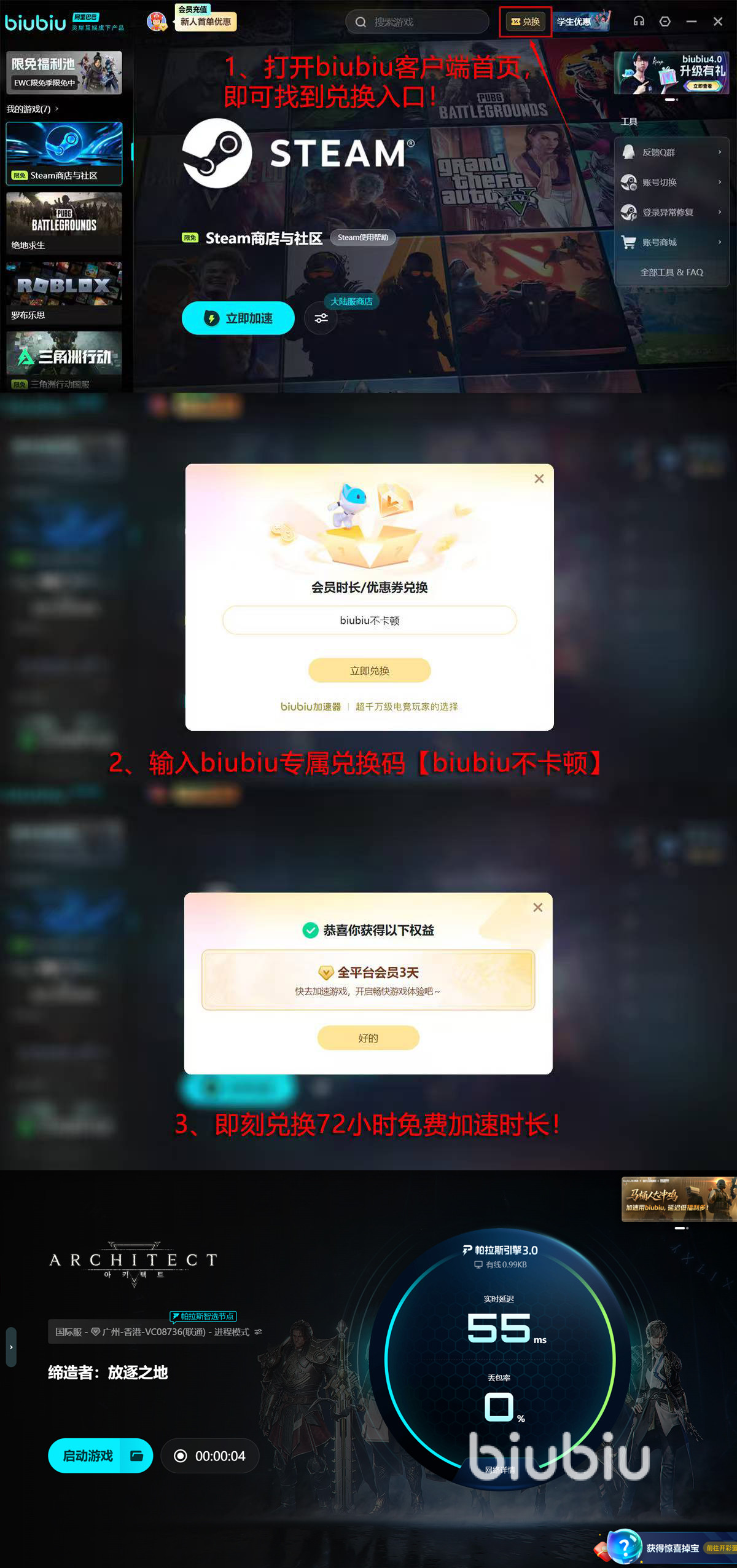 其实优化的工作,可不仅是游戏,很多软件也需要优化,并且需要吸取专业人士的建议,biubiu就通过邀请冠军选手左梓轩担任产品体验官,听取其专业意见,来对操作性进行改进,并取得了不错的效果。现在大家可以有免费体验的时长,大家通过【biubiu不卡顿】口令在首页就能兑换到3天福利,新人在注册后还能立刻再得到24小时,这样新人所获得时间总计能有96小时。