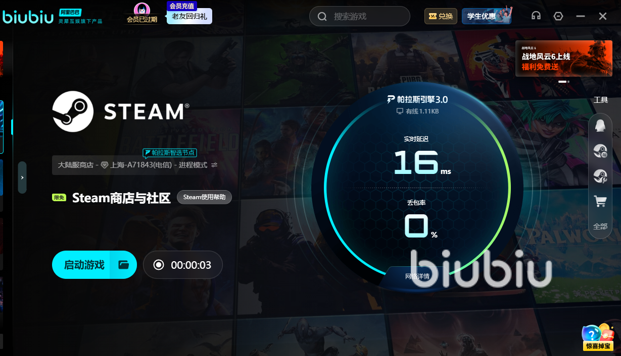 新人拥有的福利也不少,要积极领取,注册账号后,可立刻享受到免费的24小时服务时间,不够还有可以领取的优惠福利,拿【biubiu不掉线】在首页完成兑换,我们就能得到额外的72小时服务时间,新人一口气能拿96小时用了。