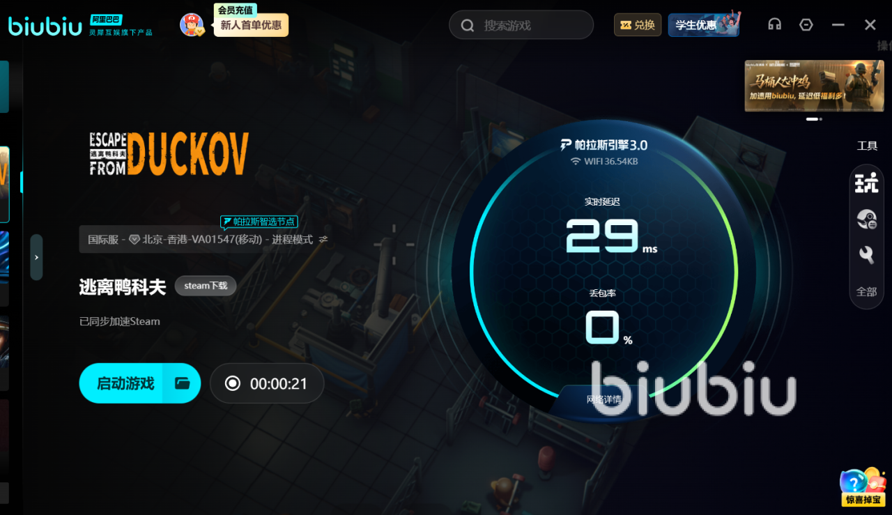 有效克服因steam验证导致的启动闪退,一款专注于游戏网络优化的专业工具不可或缺,此时,拥有极致简洁操控界面的biubiu加速器值得优先尝试。其设计真正践行了技术普惠理念,玩家只需在应用内精准点选逃离鸭科夫游戏图标,软件随即自动匹配并应用最合适、延迟最低的专属线路。即使是初次接触加速工具的新手玩家,也能零门槛体验。