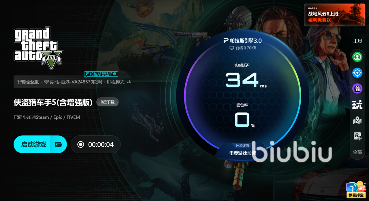 操作非常简单。打开biubiu客户端,在搜索框中输入GTA5并选择该游戏。点击游戏页面上的开启加速按钮,系统会自动检测网络状况并优化线路,无需手动设置。后台占用极低,不会影响帧率或拖慢系统性能。几秒钟后,网络通畅,重新启动游戏时加载速度加快,验证过程更加顺畅。整个过程几乎无感,就像在后台自动清除掉所有卡顿和延迟,让游戏体验更加流畅。