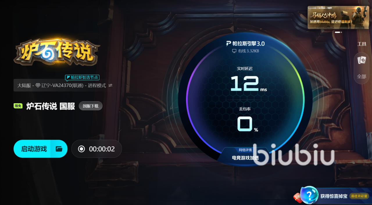 打开biubiu加速器后,整个过程就像推开一扇专门为炉石玩家准备的门。你打开客户端输入炉石传说,找到游戏后选中加速,几秒内网络就被直接接入最优节点,所有后台优化自动完成。你不用手动选择线路,也不用担心设置出错,系统会把你放在最合适的位置上。然后你回到游戏界面,熟悉的卡牌音乐响起,你知道自己是在一条不会掉线的路上重新出发,那种久违的安心感重新回到手中,仿佛每一张卡牌都在等待你的指令,而不是取决于网络的情绪