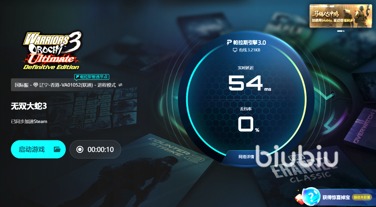 想要彻底解决掉帧问题,必须让数据传输路径变得稳定顺畅。biubiu加速器通过Steam通用加速模式为无双大蛇3终极版提供优化支持,它能智能分析当前网络状况,将数据绕过高延迟与丢包节点,重新建立直连路径。当信号传输更短更稳,服务器响应更快,画面帧率自然回归稳定。注册账号后即可获得二十四小时免费加速时长。在客户端首页输入口令【biubiu不卡顿】所有用户还能额外领取七十二小时,让战斗节奏持续多天保持流畅不卡。