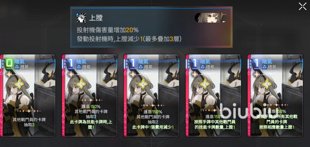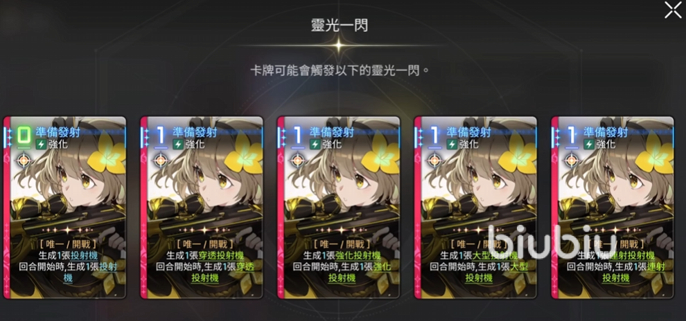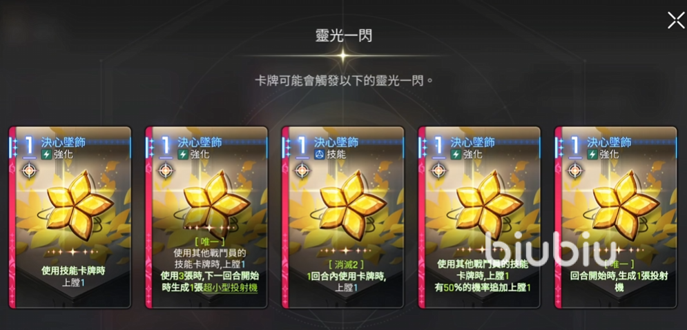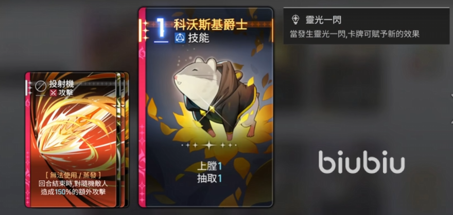 灵光一闪第二张比较特别,多了一个没使用三张其他战斗员的技能卡牌时,下一回合生成一张超小型的投射机,这个小型投射机在每回合结束时都可以随机对敌人造成40%的额外伤害。