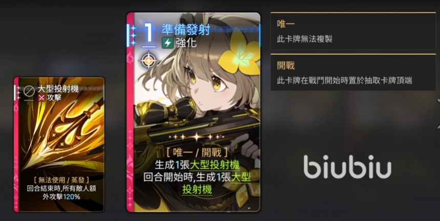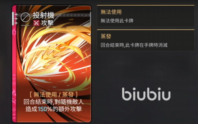 准备发射一费,标签唯一和开战,使用的时候生成一张投射机,在每个回合开始的时候,会再生成一张投射机,而投射机这张牌是没有办法使用的,不过在回合结束时,只要在大家手里,就会随机对敌人造成150%的额外攻击。再加上投射机本身有蒸发词条,所以造成伤害之后就会消失,不会进到弃牌堆里面,如果大家是不小心把这张牌洗到牌堆里面,那么回合结束的时候投射机也不会马上消灭,后续还有可能将这个牌抽回来。