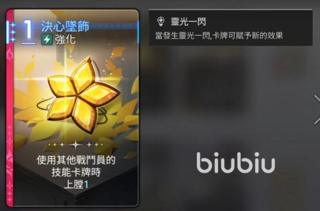 决心坠饰一费强化卡,使用其他战斗员的技能卡牌时上膛一,由于要求的是卡牌上面有技能标签,所以若是其他标签的话,那么吃不到该效果加成。