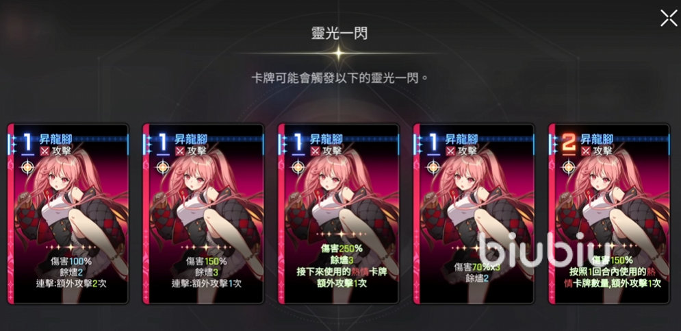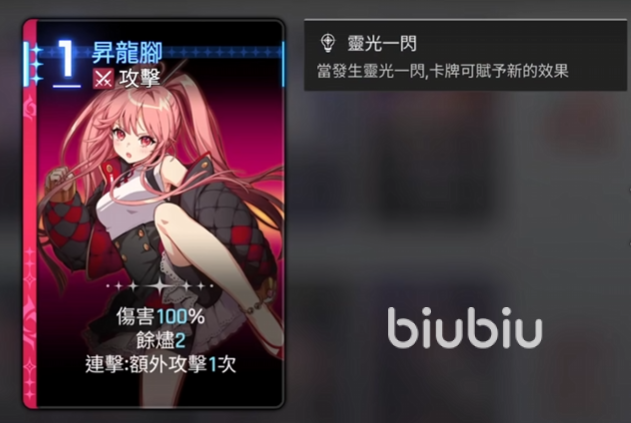昇龙脚一费攻击伤害100%,馀烬2,在梅铃使用了其他卡牌之后,昇龙角卡牌周围就会出现发光的特效,这个时候使用就能触发连击效果,得到额外攻击一次,除非队伍当中有一些跟额外攻击相关的buff,否则大家可以简单理解成伤害次数乘二即可,不过不会给敌人两次馀烬2。