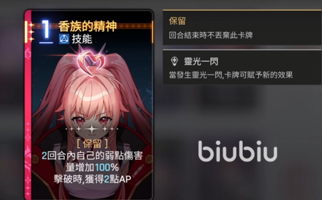 香族的精神一费,技能卡保留。两回合内自己的弱点伤害量会增加100%,在击破的时候可以得到2点ap。在战斗中使用跟怪物的弱点属性一致的卡牌攻击时,能够达成的伤害效果会更高,增加25%,而且这个弱点伤害算是一个独立的伤害乘区,比如梅铃在开场使用火龙宝石之后,基本攻击卡牌的伤害是140%,对热情属性的敌人会造成140%×1.25,也就是175%的伤害,而香族的精神所给的就是25%的弱点伤害翻倍变成50%,这个时候对热情属性的敌人使用基本卡牌攻击,伤害就可以达到210%。再加上因为火龙宝石本身就能稳定的给敌人挂热情弱点,所以这个效果给梅铃带来的收益还是比较明显的。