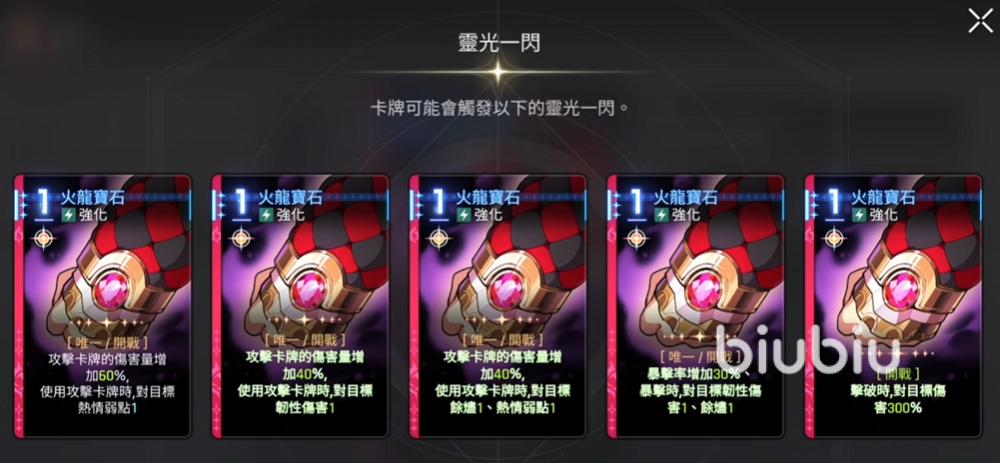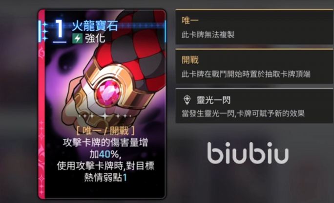 第一张独特卡牌是火龙宝石,一张强化卡,标签是唯一和开战,攻击卡牌的伤害量会增加40%,这张卡的伤害量增加是乘算效果,但是只有梅铃自己的攻击卡牌才有用,比如后面会为大家介绍的火龙惊天卡牌伤害是300%,在用完火龙宝石之后,伤害就变成300%乘1.4等于420%了。使用攻击卡牌时对目标热情弱点一,不管敌人是什么弱点属性,梅铃都具有一定的消费能力。