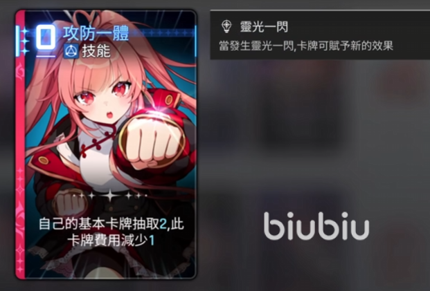 攻防一体零费,技能自己的基本卡牌抽取二,简单理解就是只会抽一费攻击跟一张一费护盾,且两张基本卡牌的费用减一。如果使用攻防一体的时候,抽牌堆的梅铃基本卡牌数量少于二的话,那这个时候就会先把弃牌堆的卡全部洗回抽牌堆,然后再抽取。