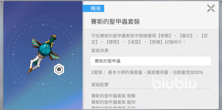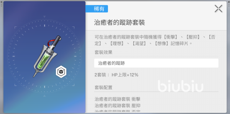 装备构成:每位角色共有6个装备槽。装备系统采用套装模式,理想情况下是为角色搭配一套4件套和一套2件套效果(装备(记忆碎片)主要通过挑战"模拟战"副本获取)。而游戏中的套装主要分为提供4件套效果和2件套效果两大类,需要注意同名的2件套效果无法叠加。