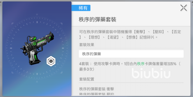 秩序的弹药:使用基础攻击卡牌时,伤害提升。