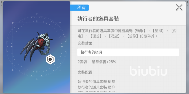 思路解析:"征服者的威势"4件套直接提高暴击率,而"执行者的道具"2件套则强化暴击后的伤害,两者结合能极大提升角色的爆发能力。