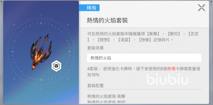 热情的火焰:打出强化类卡牌后,自身"热情"卡牌的伤害提升。