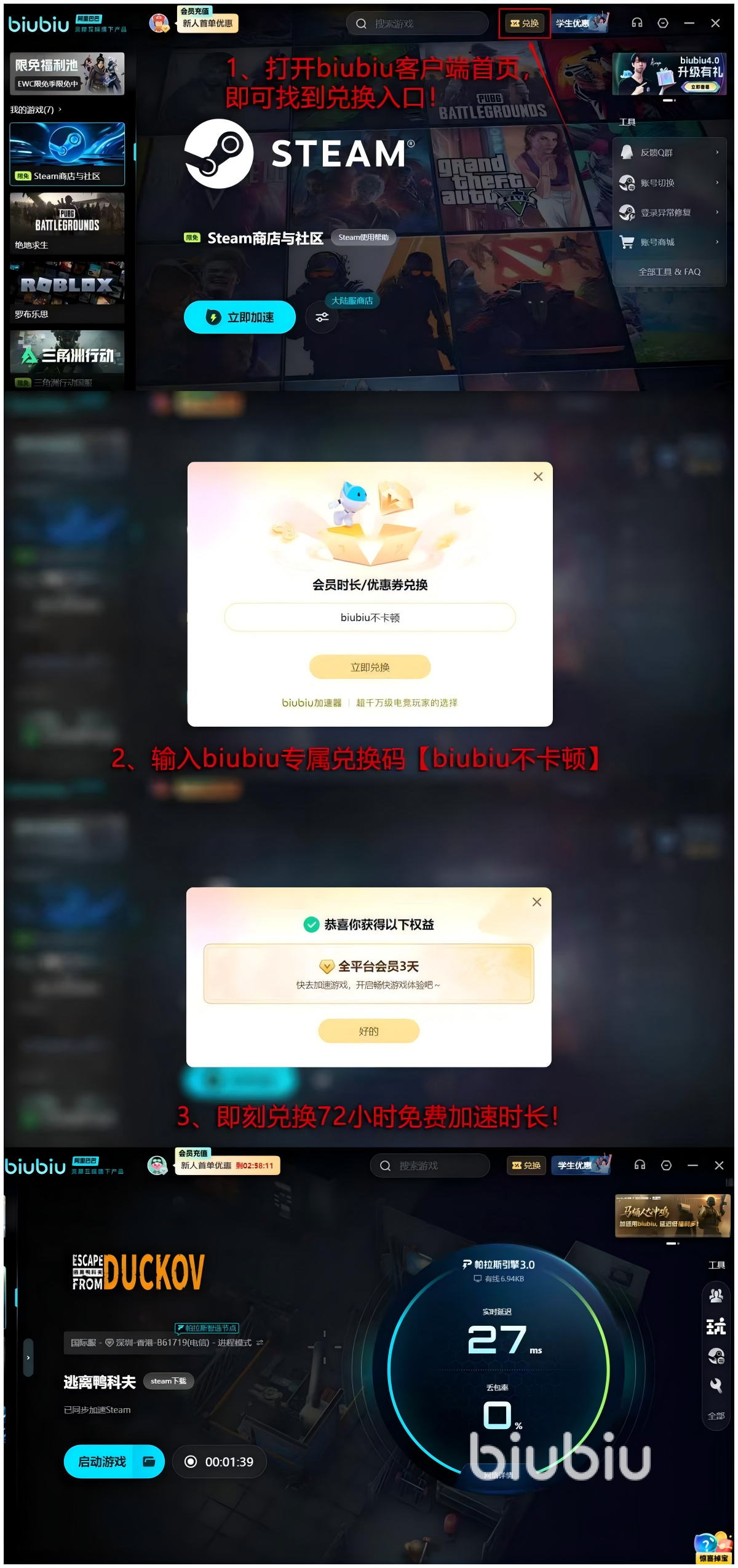 相较于普通加速器优化更好,biubiu对于游戏的专项优化更具针对性,能更好地解决各种网速需求,为玩家提供稳定的体验保障。还通过邀请电竞选手左梓轩担任产品体验官的方式,让品牌影响力更大、更加可靠,现在还有免费体验机会,各位可用【biubiu不卡顿】口令,在右上角【兑换】到3天福利,并且如是各位是新的注册用户,则还能再得到24小时福利,总计能够得到96小时,非常的划算。