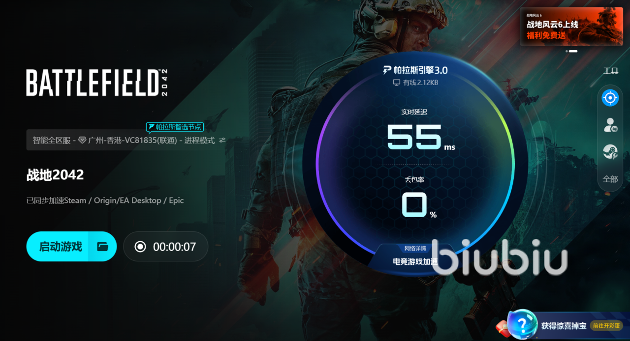 操作过程像是在为游戏打开一条隐藏入口。启动biubiu客户端,在搜索框输入战地2042名称,选择专属节点后直接启动加速。系统会在后台自动侦测网络状况并安排最稳线路,全程不需要设置端口或参数。加速开启的那一刻,链接像被重新拉直,返回游戏后加载条快速推进,画面从卡顿跳转为流畅,主界面几乎无停顿直接亮起,仿佛游戏主动迎接战斗的到来。
