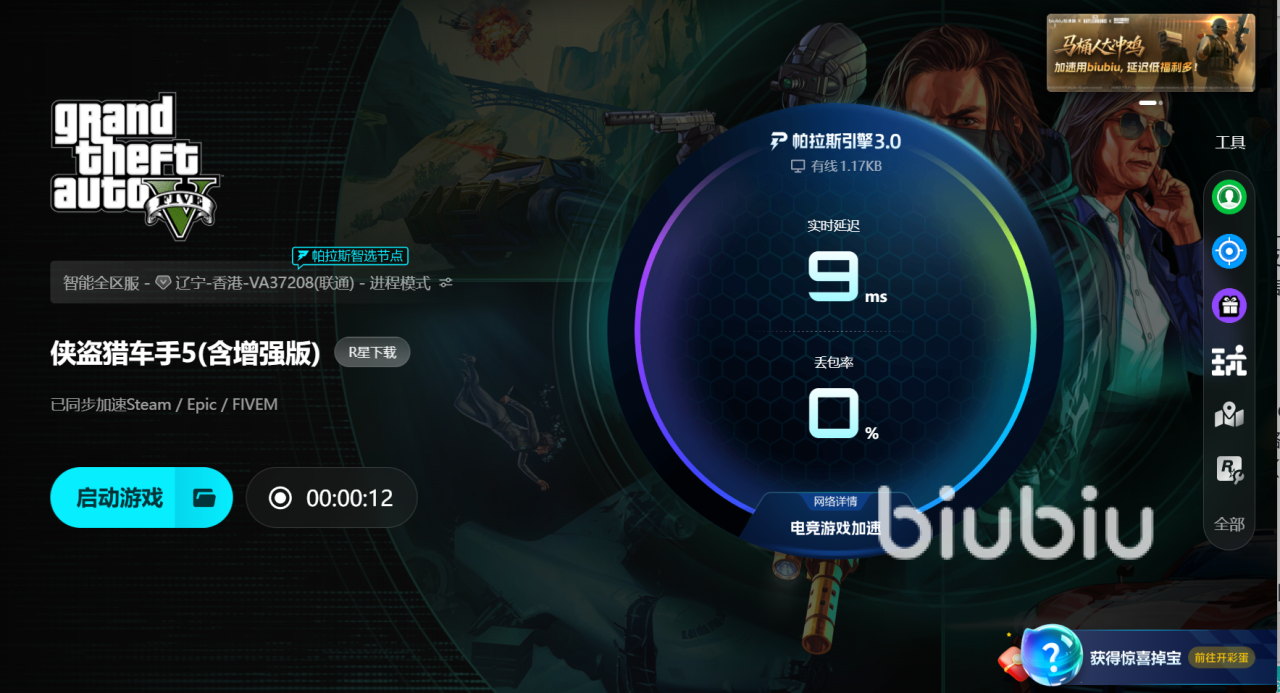 操作过程也非常省事。打开biubiu客户端,在游戏列表中选择GTA5专线后点击开启,系统会自动完成节点匹配与线路优化。后台运行轻盈不会影响帧率,也不会拖慢CPU性能。加速成功后重新打开游戏,加载界面迅速跳转,不再停留在R星标志或线上认证界面。整个过程几乎无感,却能立刻看出效果,让玩家能稳定进入游戏世界。