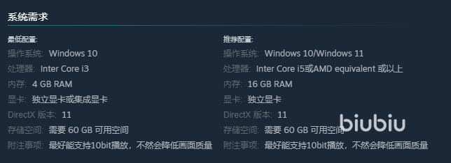 从官方公布告示可以看到,游戏设备的配置使用Windows 10/11都可以,但最少要预留60GB的存储空间下载到电脑。此外,维持运行最低需要英特尔i3代CPU,升级到i5更好,同等级AMD卡可以替换,配置时内存最少要4GB,有条件16GB更适合,用独立显卡或集成显卡都可以,但独立显卡更优,升级后的设备更支持加载高画质的流畅运行,显示包括东京实景拍摄的精致画面、7个小时长时间影像素材、以及多分支剧情选择与其他动作场景。