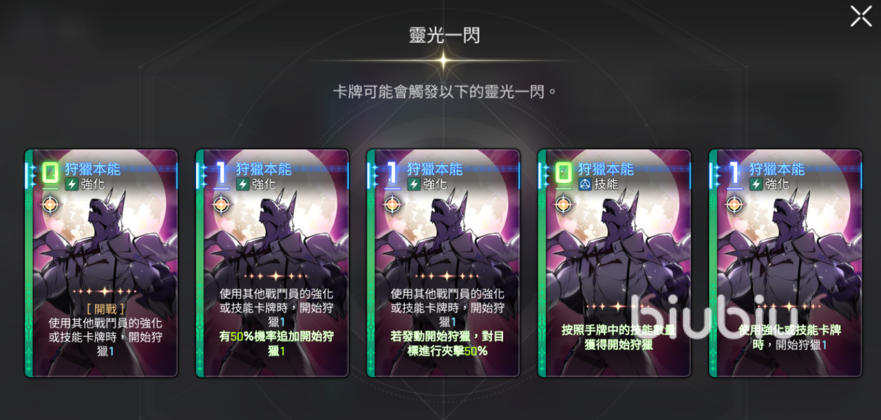 第一个就是灵光一闪,这个能力刷新之后一般是提供随机几种附加效果,让我们选择其一使用。比如雨果的狩猎本能基础作用为使用其他战斗员的强化或者技能卡牌时,开始狩猎+1,回合开始时,所有敌人的痛苦+1。但是在触发灵光一闪之后,会出现以下几种可能性,1、有50%概率追加开始狩猎1,2、若发动开始狩猎,对目标进行夹击50%,3、按照手牌中技能数量获得开始狩猎,4、使用强化或者技能卡牌时,开始狩猎+1,根据局势择优使用。