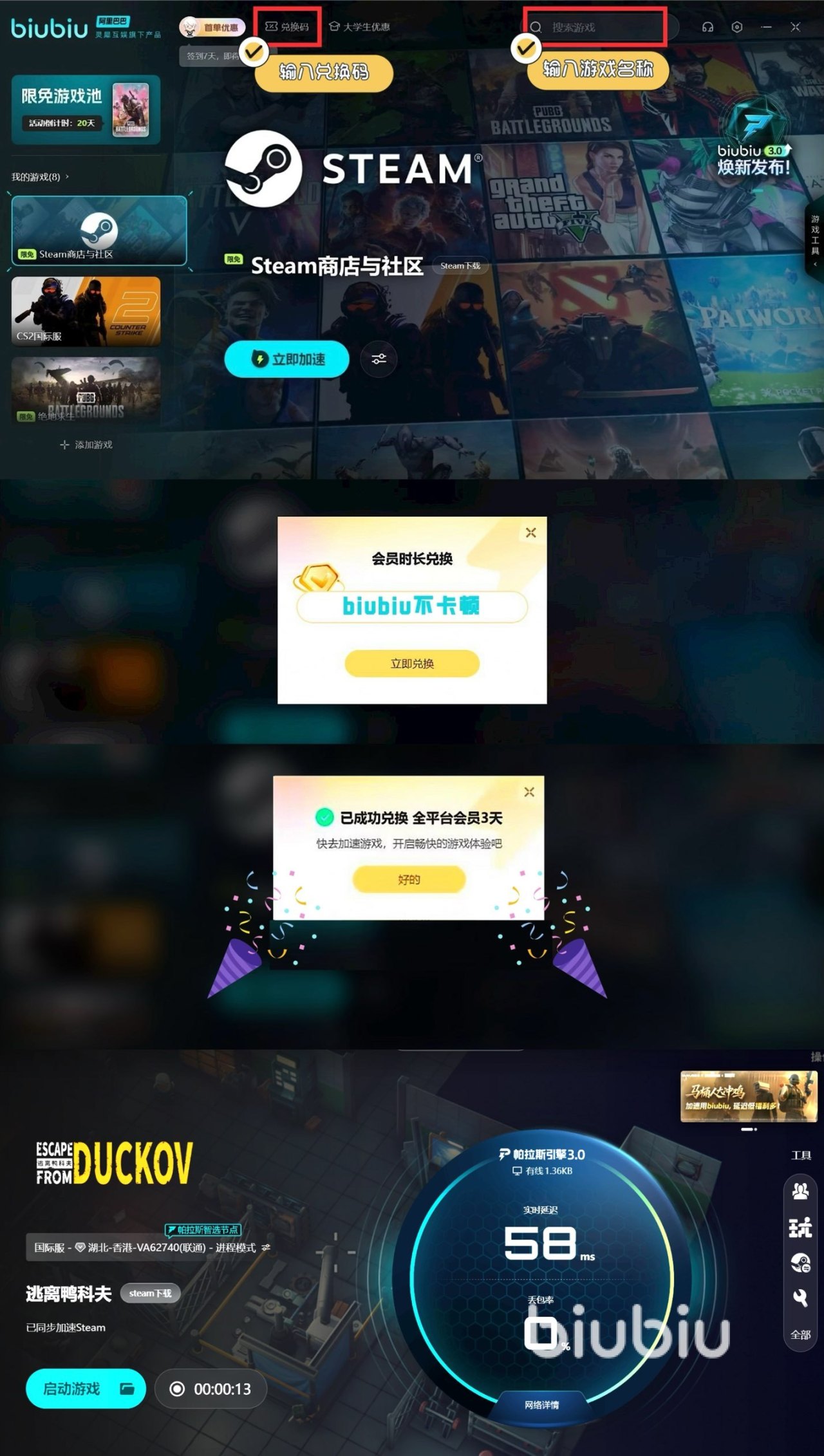 为让更多伙伴们能够零门槛体验优质服务,该加速工具给新老用户们安排了很多的福利,比如在第一次注册账户的新用户登录之后,就可以得到24h免费加速时长,不需要支付更不需要捆绑软件,就能可直观感受网络优化带来的提升。确认效果满意后再决定是否续用,彻底打消试用顾虑。结束了新人的福利之后,还可以跟平台的老用户们一起,通过【biubiu不卡顿】,额外获取到3天免费加速时间,累计可享近百小时的高质量加速服务,大家可以尽情体验。