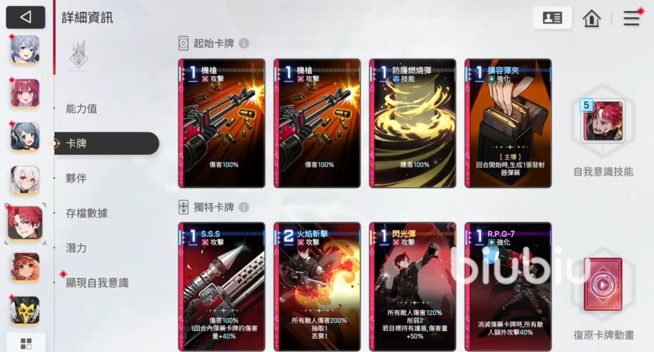 独特卡牌为S.S.S、火焰斩击、闪光弹和R.P.G-7。S.S.S1效果是回合内弹药卡牌的伤害量+40%,火焰斩击是所有敌人伤害200%,闪光弹是所有敌人伤害120%削弱2,如果目标身上带有护盾,那么伤害量有额外加成。R.P.G-7是消灭弹药卡牌时,所有敌人额外攻击40%。这个角色所具有的发射器弹药一共有5种不同类型,分别是穿甲弹、爆炸弹、扩散弹、冷却弹和火箭弹。穿甲弹可提高对护盾目标的伤害,爆炸弹能够对敌人造成削弱,扩散弹可以使所有敌人损坏,冷却弹使敌人行动次数增加,火箭弹可以使所有敌人痛苦。对方被削弱之后,伤害量减少,对方被痛苦时会受到固定的持续伤害。