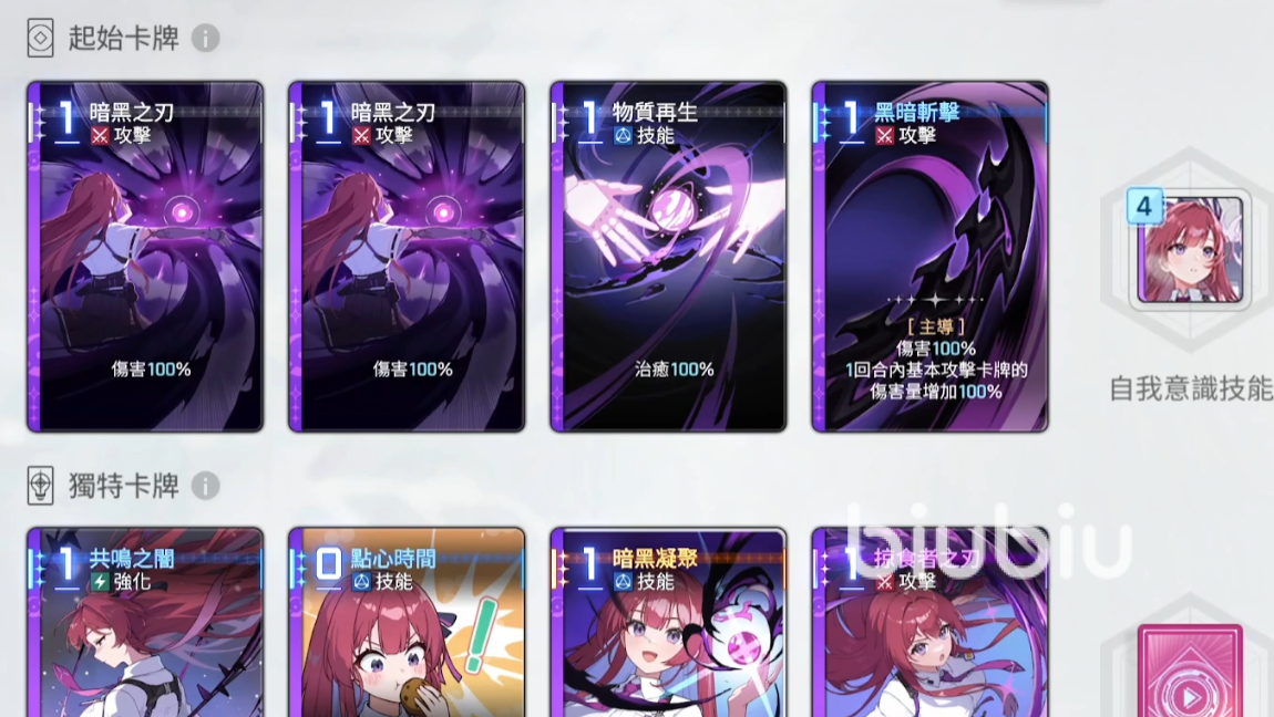 从能力上来看的话,她的独特卡牌叫做共鸣之暗,用了后可增加低费卡牌的伤害。所以建议一开始就使用,能够提升后续的输出。她的核心技能叫做暗黑凝聚,使用之后可以强化手牌中的攻击卡牌。建议先用这招强化其他卡牌,再打出去的话,可以造成更高的伤害。